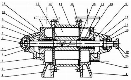1.端蓋 2.后吸排氣園盤 3.葉輪 4.軸承架 5.園螺母 6.后軸承壓蓋 7.軸 8.軸承 9. 后軸套10.填料壓圈 11.填料 12.填料壓圈 13.平鍵 14.泵體 15.連通管 16.前吸排氣園盤 17.前 軸套 18.聯(lián)軸器具 19.平鍵 20.園螺母 21.前軸承壓蓋