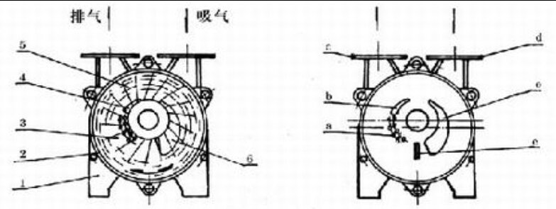 圖1 圖2 1.端蓋 2. 泵體 3.葉輪 4.排氣孔 5.水環(huán) 6.吸氣孔 a.橡膠球孔 b.泵體 c.排氣管 d吸氣管 e吸氣孔 f 進水