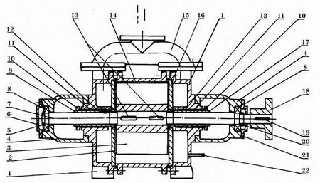 9. 后軸套10.填料壓圈 11.填料 12.填料壓圈 13.平鍵 14.泵體 15.連通管 16.前吸排氣園盤 17.前 軸套 18.聯(lián)軸器具 19.平鍵 20.園螺母 21.前軸承壓蓋